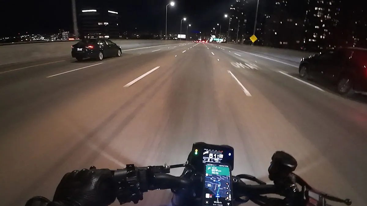 Dit is de San Francisco Bay Bridge. Een 14 kilometer lange brug die zich uitstekend laat lenen voor race-activiteiten. Een mooi recht stuk, met een fantastisch uitzicht. Wil je echt veel te hard rijden, dan kan dat hier. Een motorrijder is daar wel het slachtoffer van geworden. Terwijl hij, zoals hij zelf zegt, ‘zich netjes aan de wet houdt’, scheurt een automobilist hem voorbij, en wordt hij van z’n motor geschept.
