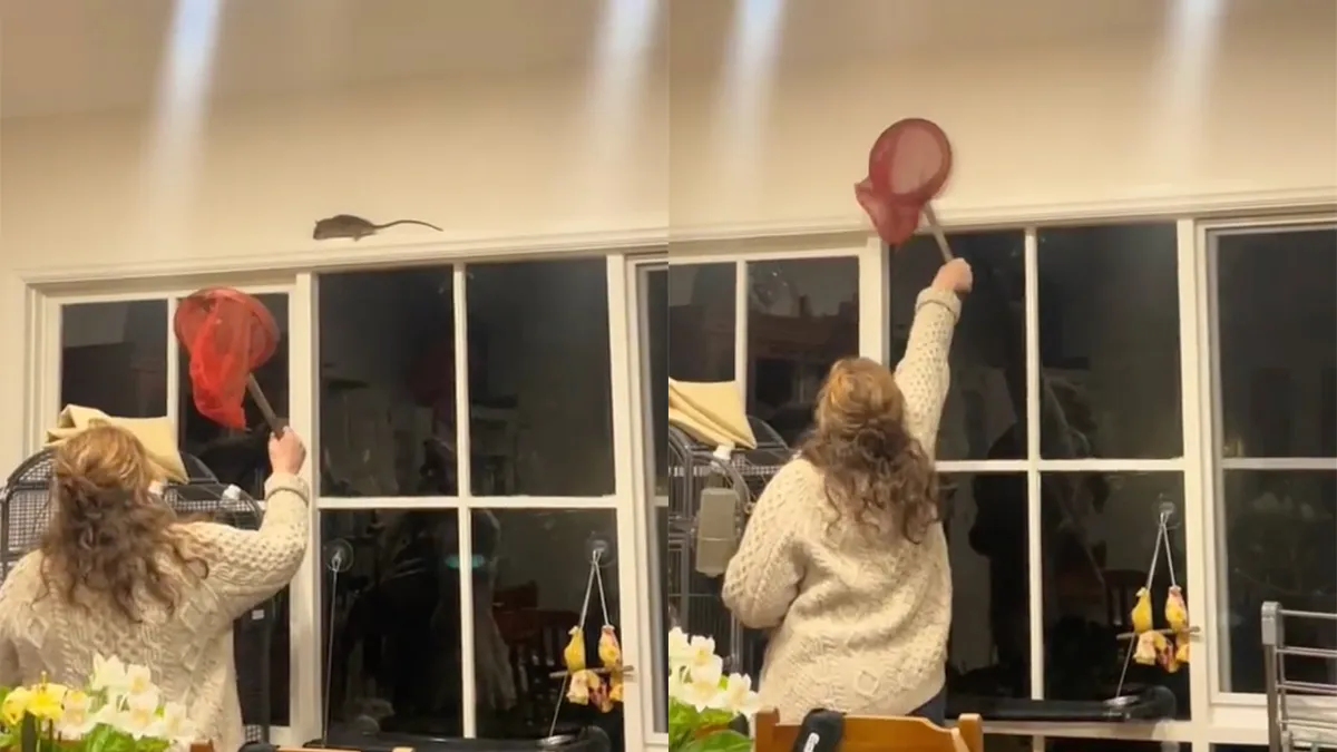 Ratten. Daar kun je flink last van hebben. Vooral als ze al liggen te fermenteren in de kruipruimte van je woning. Krijg je behoorlijke stank van. Deze rat is nog springlevend en heeft een plekje gevonden in de keuken van deze meid. Als een ware rattenvanger van Hamelen gaat ze achter hem aan. Kennelijk heeft ze geen vriend, of is haar vriend een mietje die niet van ongedierte houdt (wie wel?).