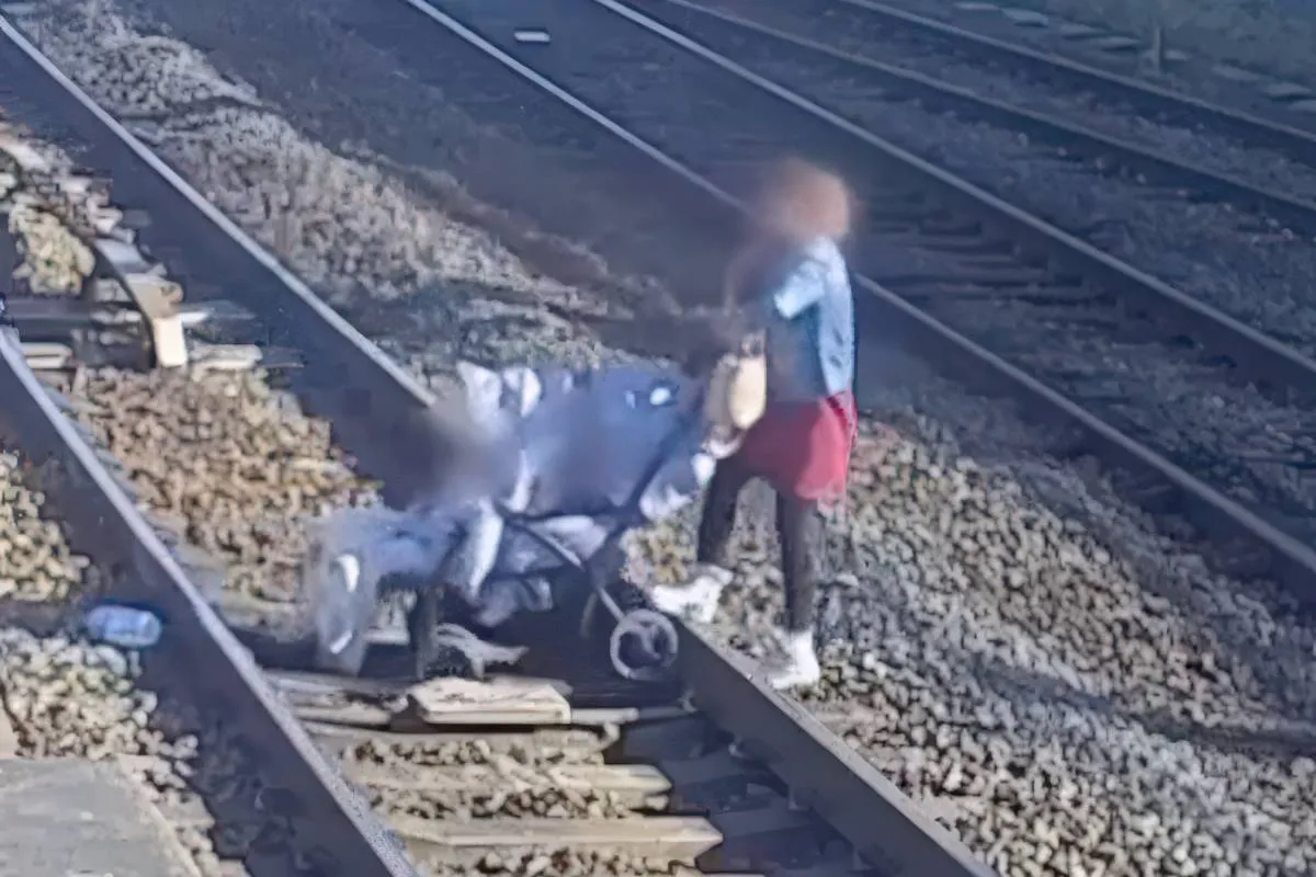 Op de videobeelden is te zien hoe de moeder met moeite de buggy over de sporen tilt. Tijdens deze riskante actie verliest ze een fles water en een deken. Terwijl ze haar spullen opraapt, blijft de kinderwagen midden op de sporen staan. Gelukkig liep het incident goed af en raakten zowel de vrouw als de kinderen niet gewond.