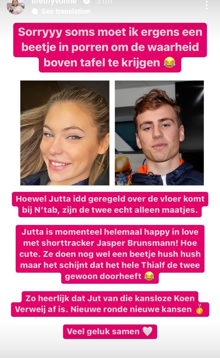 “Jutta is momenteel helemaal happy in love met collega schaatser en shorttracker, Jasper Brunsmann! Hoe cute. Ze doen nog wel een beetje hush hush maar het schijnt dat het hele Thialf de twee doorheeft. Zo heerlijk dat ze van die kansloze Koen Verweij af is”, aldus Coldeweijer. Het tweetal heeft de relatie nog niet bevestigd.
